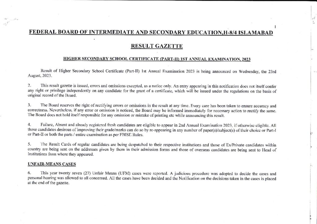 FBISE HSSC 12th Class Result 2023